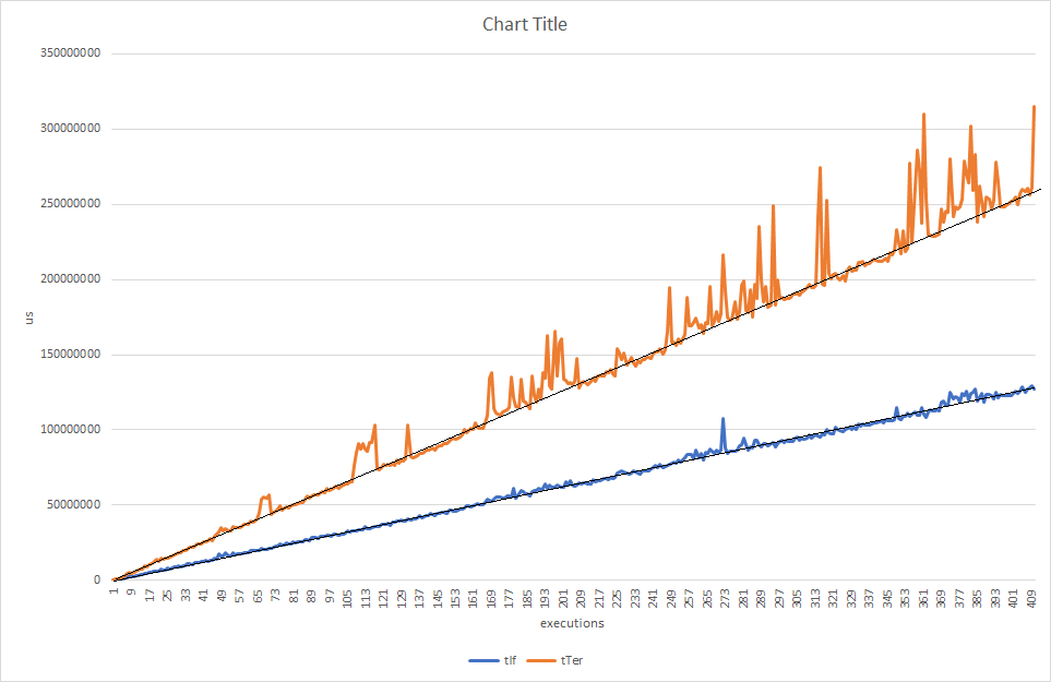 After running in loop n=41000000 I have collected some data and the chart shows simple answer as the iteration goes up the difference in time execution also grows.